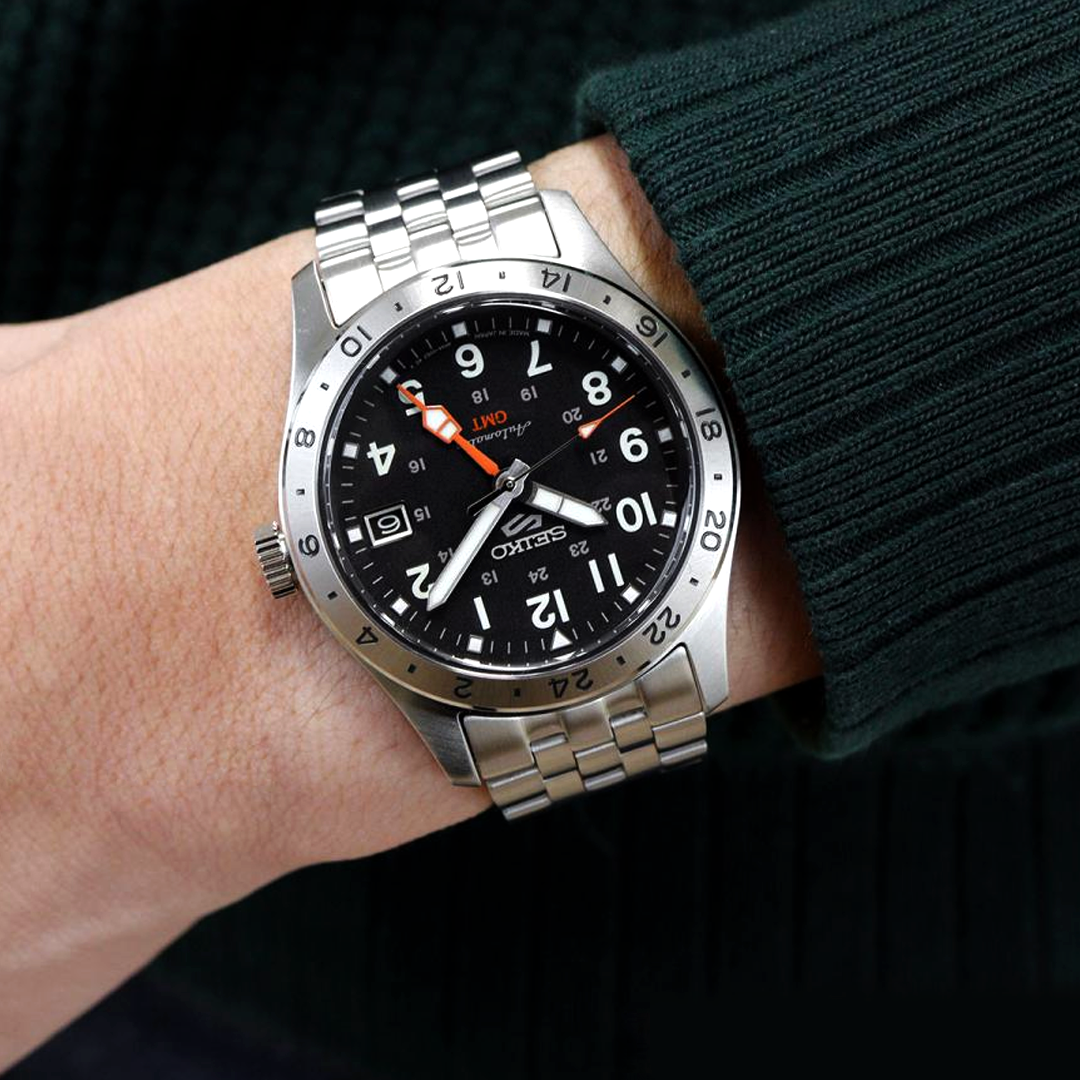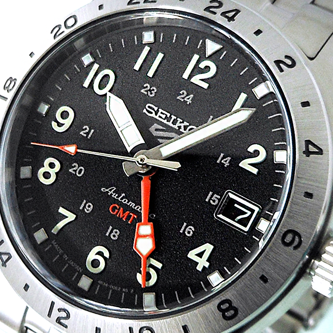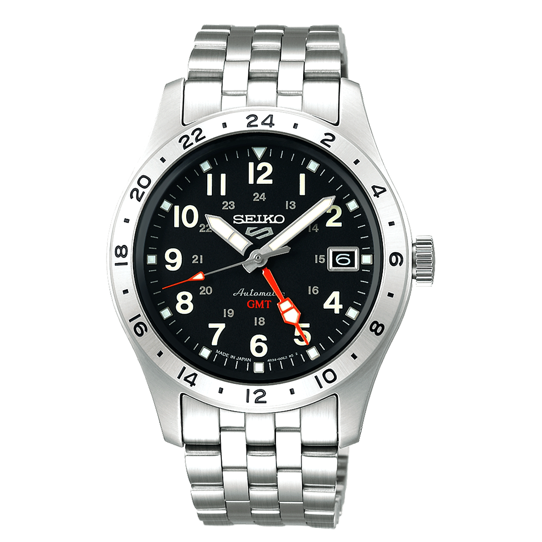 The Seiko SBSC011 is a Seiko 5 Sports Field GMT watch featuring a stainless steel case, white dial with Lumibrite, automatic Caliber 4R34 movement, curved Hardlex crystal, 100m water resistance, fixed 24-hour bezel, and a 39.5mm diameter known for its classic field watch look with modern GMT functionality.