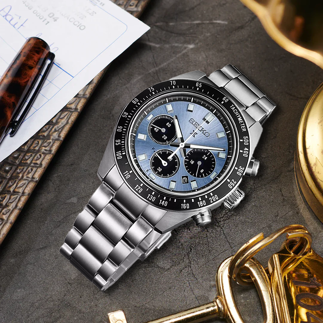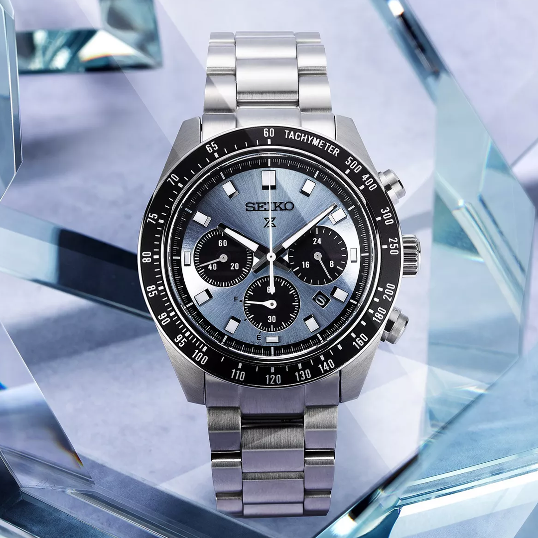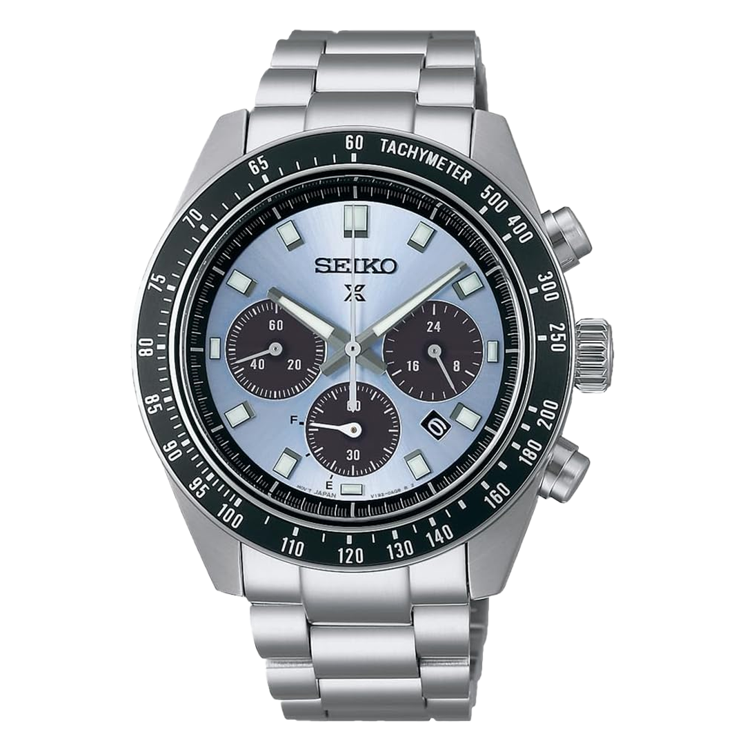 The Seiko SBDL109 (also known as SSC935) is a Solar-Powered ProspexSpeed timer chronograph featuring a V192 movement, an ice-blue panda dial, sapphire crystal, 100m water resistance, stainless steel case and bracelet, tachymeter, date display, and stopwatch function, characteristic of its JDM (Japan Domestic Market) "Iced Panda" design.